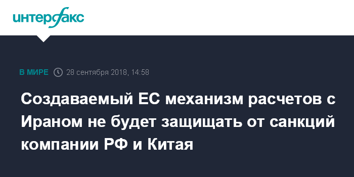 "Этот механизм, как мы понимаем, предназначен исключительно для защиты от антииранских санкций США европейских компаний. Предполагается, что Россия и КНР будут принимать защитные меры для своих экономических операторов самостоятельно", - пояснил источник.