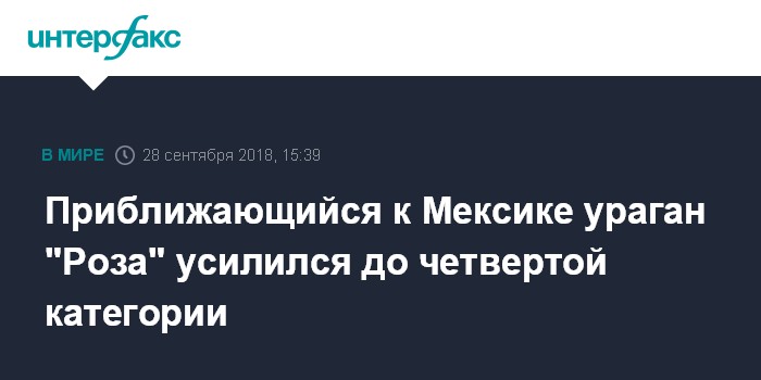 Москва. 28 сентября. INTERFAX.RU - Ураган "Роза", направляющийся к Тихоокеанскому побережью Мексики, достиг четвертой категории, сообщает в пятницу телеканал CBS.