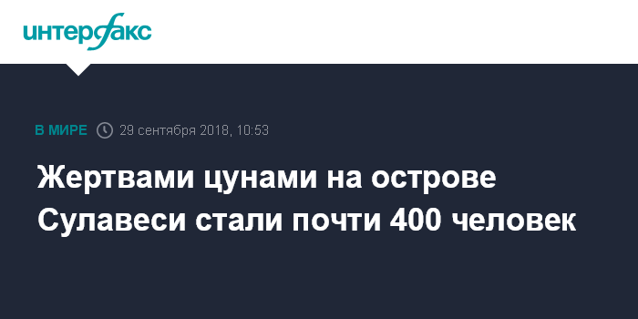Москва. 29 сентября. INTERFAX.RU - Более 380 человек погибли в результате цунами, которое обрушилось на город Палу на индонезийском острове Сулавеси, сообщает в субботу Агентство по борьбе с последствиями стихийных бедствий Индонезии.