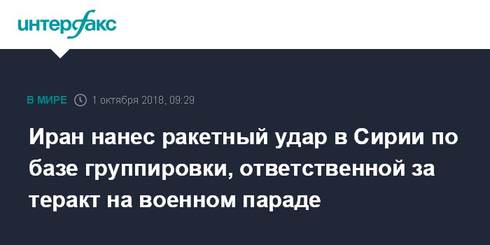 Москва. 1 октября. INTERFAX.RU - Ракетчики Корпуса Стражей Исламской революции (КСИР) выпустили шесть баллистических ракет средней дальности в ходе удара по штаб-квартире базирующейся в Сирии восточнее Евфрата группировки, ответственной за произошедший 22 сентября теракт в Ахвазе на юго-западе Ирана, сообщает в понедельник новостной сайт КСИР "Сипах Ньюз".