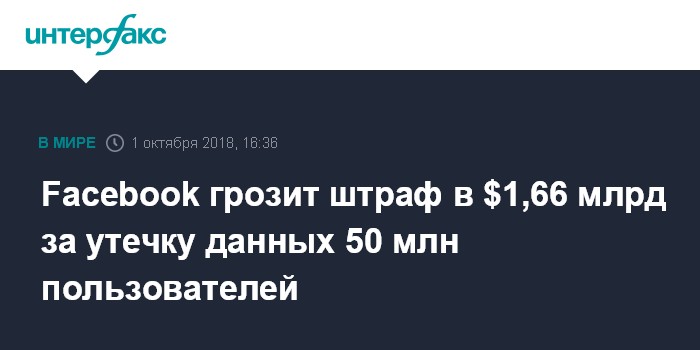Москва. 1 октября. INTERFAX.RU - Комиссия по защите данных (Data Protection Commission, DPC) Ирландии, где находится европейская штаб-квартира Facebook, может оштрафовать компанию на сумму, составляющую 4% глобальной выручки, или около $1,66 млрд, в связи с утечкой данных более 50 млн пользователей по всему миру, пишет The Wall Street Journal.