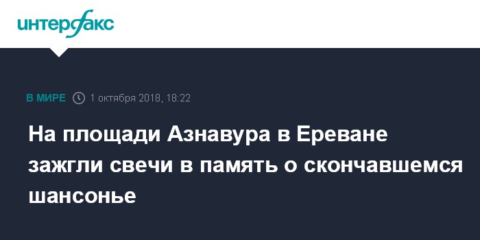 Москва. 1 октября. INTERFAX.RU - Тысячи граждан Армении зажгли свечи на площади Азнавура в центре Еревана в память о скончавшемся в понедельник всемирно известном шансонье Шарле Азнавуре.