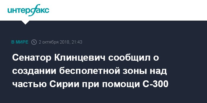 Москва. 2 октября. INTERFAX.RU - Часть территории Сирии будет закрыта для иностранной военной авиации после развертывания систем ПВО С-300, сообщил "Интерфаксу" во вторник член комитета по обороне и безопасности Совета Федерации Франц Клинцевич.