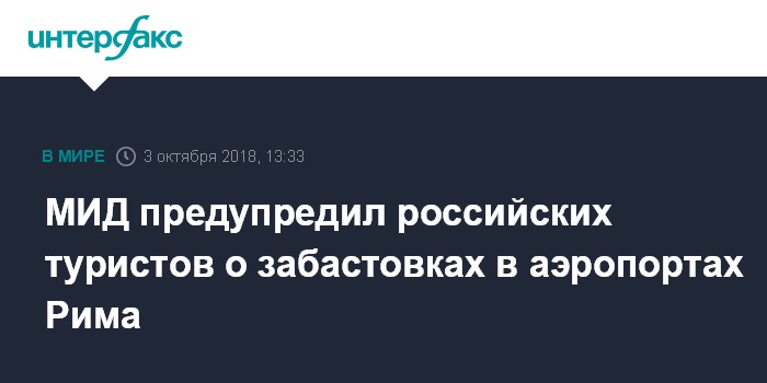 Москва. 3 октября. INTERFAX.RU - Забастовки технических служб пройдут в крупнейших аэропортах Рима, возможны задержки и отмена рейсов, сообщает ситуационно-кризисный центр (ДСКЦ) МИД РФ.