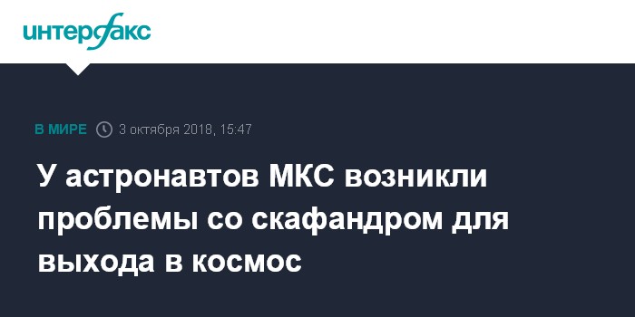 Москва. 3 октября. INTERFAX.RU - У астронавтов на Международной космической станции (МКС) возникли проблемы с одним из скафандров для выхода в открытый космос, починить его пока не удалось, он будет заменен.