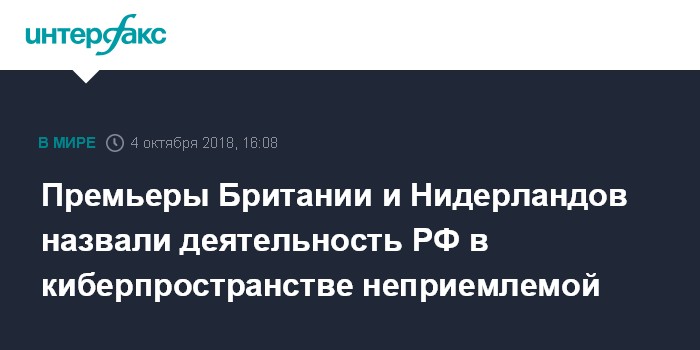 Москва. 4 октября. INTERFAX.RU - Премьер-министры Великобритании и Нидерландов Тереза Мэй и Марк Рютте назвали деятельность российской военной разведки в киберпространстве неприемлемой.
