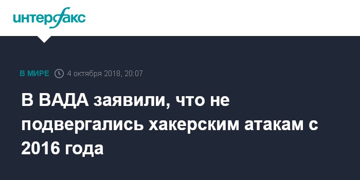 "Нет свидетельств попыток взлома систем ВАДА с 2016 года", - сказал "Интерфаксу" главный менеджер агентства по медиа-отношениям Джеймс Фиджеральд в четверг.