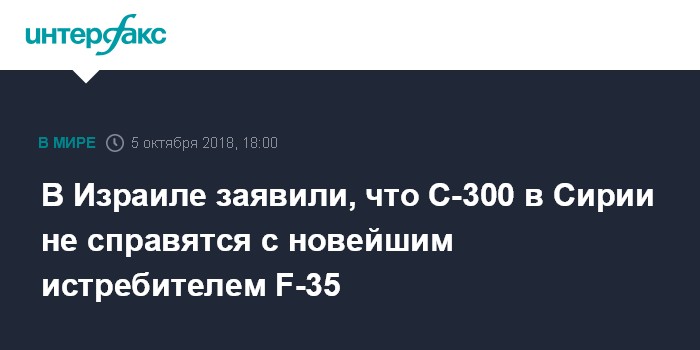 Москва. 5 октября. INTERFAX.RU - Поставка российских зенитных ракетных комплексов С-300 в Сирию не скажется на эффективности израильских ВВС, располагающих американскими стелс-истребителями пятого поколения F-35, заявил министр регионального сотрудничества Израиля Цахи Ханегби.