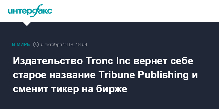 Москва. 5 октября. INTERFAX.RU - Американское издательство Tronc Inc с 9 октября вернет себе старое название Tribune Publishing Co. и сменит тикер на бирже NYSE с TRNC на TPCO, говорится в пресс-релизе компании.