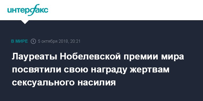 Москва. 5 октября. INTERFAX.RU - Лауреаты Нобелевской премии мира 2018 года, медик из Демократической Республики Конго Денис Муквеге и правозащитница из Ирака Надя Мурад, посвятили свою награду женщинам, ставшим жертвами сексуального насилия, передают в пятницу западные СМИ.
