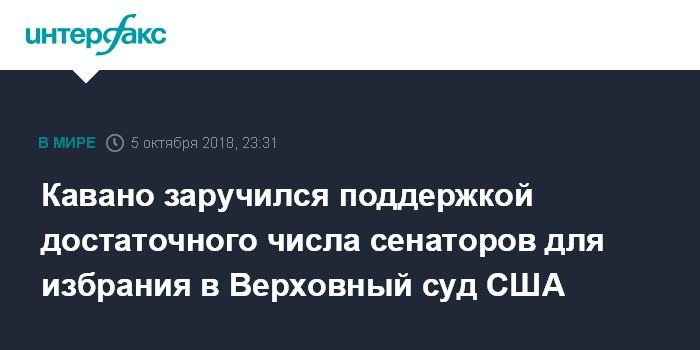 Москва. 5 октября. INTERFAX.RU - Кандидат на пост судьи Верховного суда США Бретт Кавано, согласно последним данным, заручился поддержкой достаточного числа сенаторов, чтобы быть утвержденным на этот пост на голосовании в субботу. По данным американских СМИ, два сенатора, поддержку Бретту Кавано в пятницу высказали сенатор-демократ Джо Манчин и сенатор-республиканец Сьюзан Коллинз. Оба ранее заявляли, что еще не определились со своей позицией.