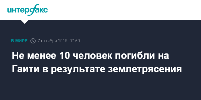 Москва. 7 октября. INTERFAX.RU - Как минимум 10 человек стали жертвами землетрясения на Гаити, сообщило в воскресенье агентство "Синьхуа".