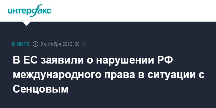 Москва. 8 октября. INTERFAX.RU - Официальный представитель Европейской внешнеполитической службы (ЕВС) заявил, что считает заключение украинского режиссера Олега Сенцова в России "нарушением международного права и элементарных стандартов правосудия".