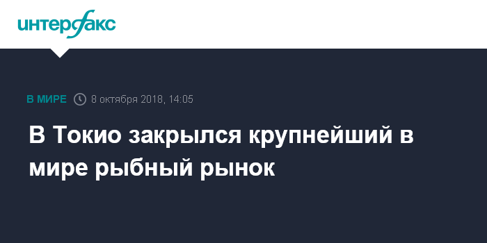 Москва. 8 октября. INTERFAX.RU - Токийский рыбный рынок Цукидзи, старейший и крупнейший в мире, в минувшие выходные провел последний аукцион. В четверг на этой неделе он переезжает на новое место в районе Тоёсу, немного дальше от центра Токио, сообщает газета Tokyo Shimbun.
