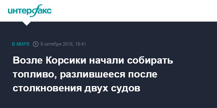 Москва. 8 октября. INTERFAX.RU - Италия и Франция приступили к очистке от топлива вод возле острова Корсика после того, как ранее в этой части Средиземного моря столкнулись два судна, сообщают в понедельник западные СМИ.
