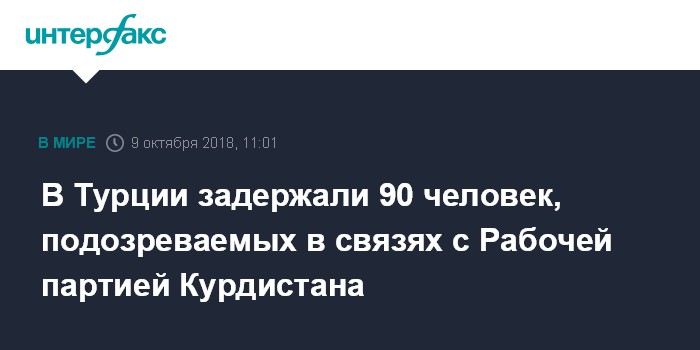 Москва. 9 октября. INTERFAX.RU - Службы безопасности Турции задержали 90 человек, которых подозревают в связях с запрещенной Анкарой Рабочей партией Курдистана, сообщает во вторник агентство "Анадолу".