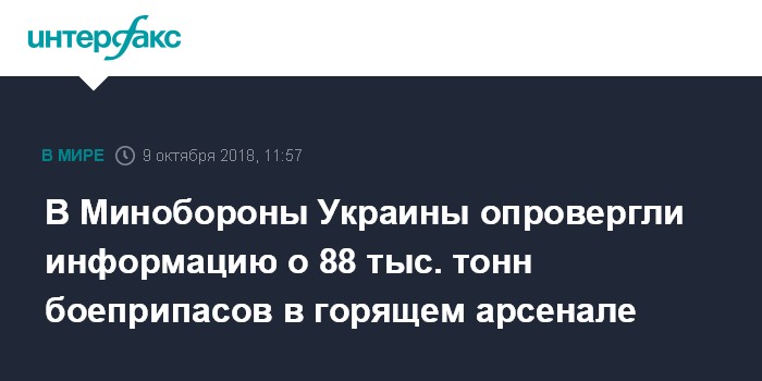 Москва. 9 октября. INTERFAX.RU - В Минобороны Украины опровергают опубликованную ранее на сайте Государственной службы по чрезвычайным ситуациям (ГСЧС) информацию о том, что в горящих в Черниговской области военных складах находится около 88 тысяч тонн боеприпасов.