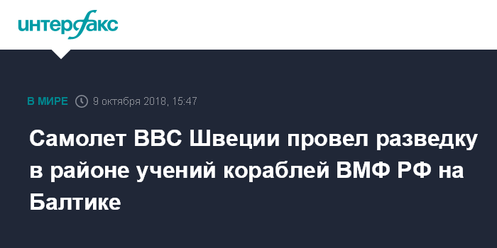 Москва. 9 октября. INTERFAX.RU - Шведский военный самолет во вторник совершил длительный разведывательный полет вблизи Калининградской области на фоне учений российского Балтфлота, следует из мониторинговых данных западных авиационных ресурсов.