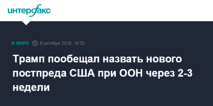 Москва. 9 октября. INTERFAX.RU - Процесс определения того, кто сменит Никки Хейли на посту постпреда США при ООН, займет две или три недели, заявил во вторник президент США Дональд Трамп.