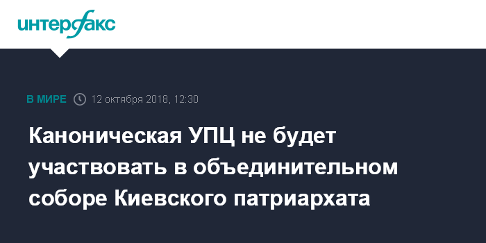 Москва. 12 октября. INTERFAX.RU - Украинская православная церковь не будет участвовать в объединительном соборе, который инициировал накануне глава Киевского патриархата Филарет (Денисенко), заявил "Интерфаксу" глава пресс-службы УПЦ Василий Анисимов.
