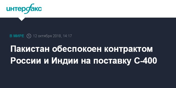Москва. 12 октября. INTERFAX.RU - Пакистан выразил недовольство контрактом на поставку Индии российских зенитных ракетных систем С-400; об этом в четверг заявил официальный представитель МИД этой страны Мохаммад Фейсал.