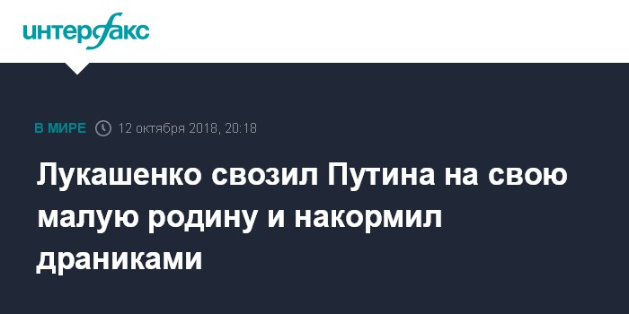 Москва. 12 октября. INTERFAX.RU - Президенты Белоруссии и России Александр Лукашенко и Владимир Путин после завершения официальных мероприятий, связанных с их участием в V Форуме регионов, уделили несколько часов неформальному общению, сообщило государственное агентство БелТА.