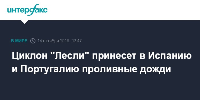 Москва. 14 октября. INTERFAX.RU - Приближающийся к западному побережью Португалии и Испании пост-тропический циклон "Лесли" может принести в эти страны сильный ветер и проливные дожди, сообщил в субботу Национальный центр наблюдения за ураганами США.
