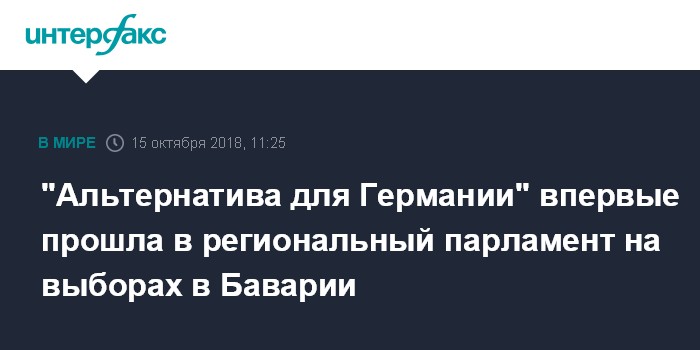 Москва. 15 октября. INTERFAX.RU - Правая партия "Альтернатива для Германии" (АдГ) набирает 10,2% голосов на выборах в Баварии и впервые проходит в региональный парламент. Христианско-социальный союз (ХСС) теряет места, набрав 37,2% голосов. Об этом свидетельствуют предварительные итоги голосования, опубликованные баварским избиркомом.