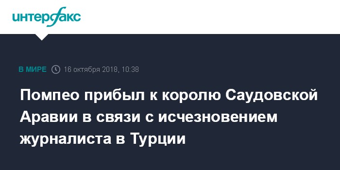 Москва. 16 октября. INTERFAX.RU - Глава госдепа США Майк Помпео во вторник приземлился в Эр-Рияде, где намерен провести встречу с королем Саудовской Аравии Салманом Аль Саудом и обсудить ситуацию с исчезновением саудовского журналиста Джамаля Хашкаджи в саудовском генконсульстве в Стамбуле.