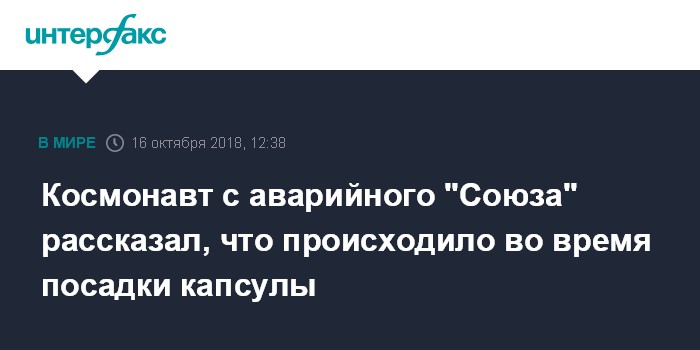 Очередная международная экспедиция на российском пилотируемом корабле "Союз МС-10" отправилась на МКС в минувший четверг, 11 октября, с космодрома Байконур, Однако из-за нештатной ситуации, случившейся спустя две минуты после старта корабля, экипажу пришлось совершить аварийную посадку в Казахстане. В составе экипажа были космонавт Алексей Овчинин и астронавт Ник Хейг. Состояние их здоровья не вызывает опасений.