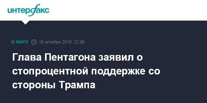 Москва. 16 октября. INTERFAX.RU - Министр обороны США Джеймс Мэттис заявил во вторник, что президент Дональд Трамп выразил ему свою поддержку, несмотря на то, что ранее публично говорил о возможности его отставки, сообщают во вторник американские СМИ.