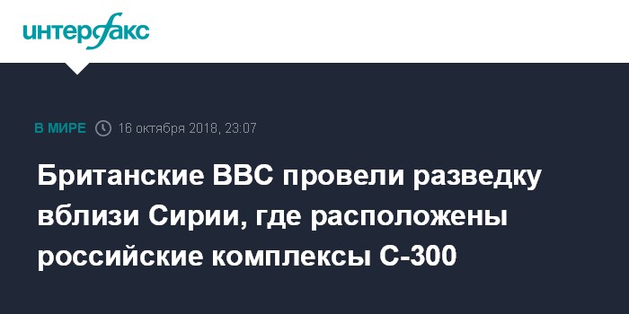 Москва. 16 октября. INTERFAX.RU - Два британских разведывательных самолета во вторник совершили пролеты вблизи территории Сирии, где развернуты российские зенитные ракетные системы С-300, следует из мониторинговых данных западных авиационных ресурсов.