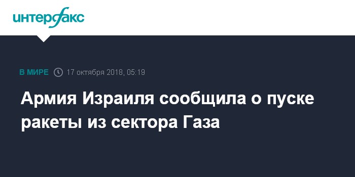 Москва. 17 октября. INTERFAX.RU - Армия Израиля сообщила о пуске ракеты из сектора Газа, в городе Беер-Шеве сработали сирены воздушной тревоги, сообщается в среду в твиттере.