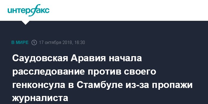 Москва. 17 октября. INTERFAX.RU - Саудовские власти в среду инициировали расследование в отношении генконсула Саудовской Аравии в Стамбуле Мухаммеда Утайби на фоне расследования об исчезновении саудовского журналиста Джамаля Хашкаджи, сообщают СМИ страны.