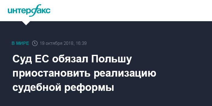 Москва. 19 октября. INTERFAX.RU - Европейский суд вынес постановление по делу "Еврокомиссия против Польши", в соответствии с которым польские власти обязаны приостановить реализацию национальной судебной реформы, говорится в пресс-релизе суда, опубликованном в пятницу.