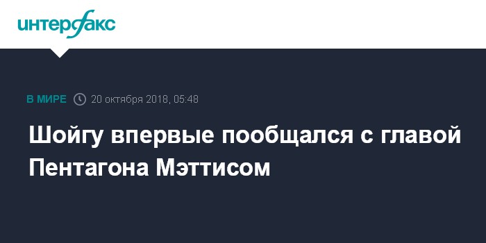 Москва. 20 октября. INTERFAX.RU - Первая личная встреча министров обороны России Сергея Шойгу и США Джеймса Мэттиса состоялась "на полях" Пятого совещания министров обороны АСЕАН и партнёров по диалогу ("СМОА плюс"), которое открылось в Сингапуре в субботу.