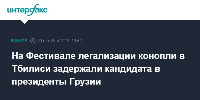 Москва. 20 октября. INTERFAX.RU - На Фестивале легализации конопли, который в субботу проводит в парке "Дедаэна" в центре Тбилиси оппозиционная партия "Новый политический центр - Гирчи", полиция задержала одного из ее лидеров, кандидата в президенты Грузии Зураба Джапаридзе. Ранее он выступил против введения ограничений на курение марихуаны в Грузии.
