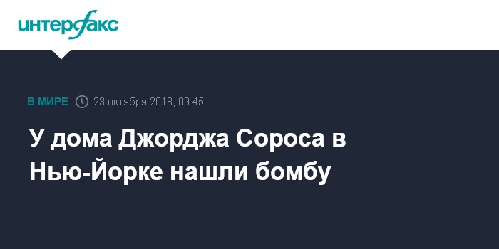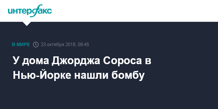 Москва. 23 октября. INTERFAX.RU - Взрывное устройство было обнаружено у дома американского миллиардера Джорджа Сороса в округе Уэстчестер (штат Нью-Йорк), сообщает The Wall Street Journal. Самого 88-летнего Сороса в этот момент не было на месте.