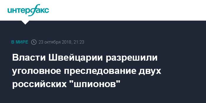 Москва. 23 октября. INTERFAX.RU - Правительство Швейцарии (Федеральный совет) предоставило прокуратуре страны разрешение инициировать уголовное преследование двух граждан РФ, которые, по версии следствия, могли заниматься шпионажем на швейцарской территории, сообщает во вторник сайт Swissinfo.