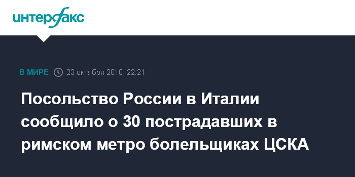 "По данным службы гражданской защиты Италии, в римской подземке пострадали до 30 болельщиков @pfc_cska. Оказываем максимально возможную помощь", - говорится в твиттере дипмиссии.