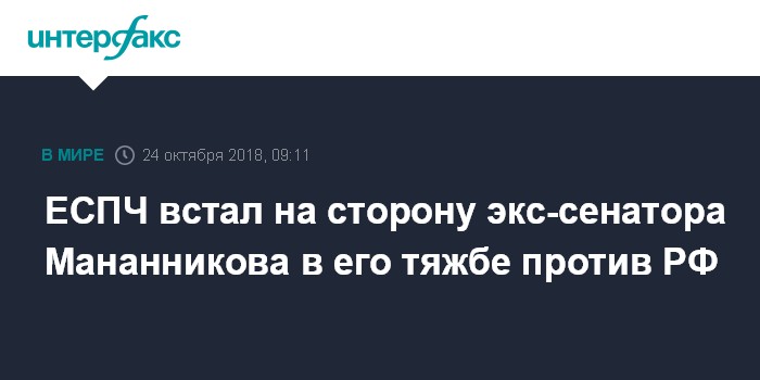 Москва. 24 октября. INTERFAX.RU - Европейский суд по правам человека (ЕСПЧ) вынес решение по делу "Мананников против России" в пользу бывшего новосибирского сенатора и правозащитника Алексея Мананникова, следует из материалов суда.