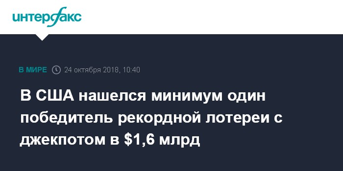 Москва. 24 октября. INTERFAX.RU - Организаторы американской лотереи Mega Millions объявили о том, что в розыгрыше рекордного в истории джекпота на сумму $1,6 млрд есть как минимум один победитель.