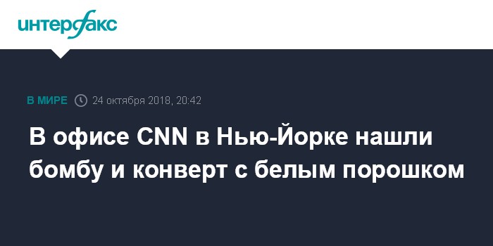 Москва. 24 октября. INTERFAX.RU - Начальник полиции Нью-Йорка Джим О'Нейл заявил в среду на пресс-конференции, что в поступившей в центральный офис CNN посылке были найдены взрывное устройство и конверт с белым порошком.