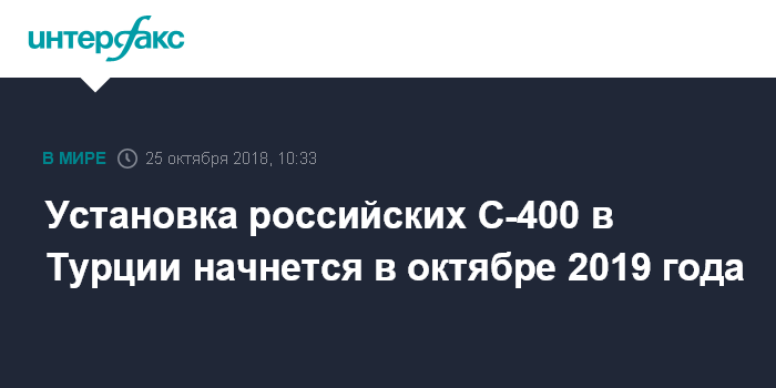 Москва. 25 октября. INTERFAX.RU - Установка российских зенитных ракетных систем С-400 в Турции начнется в октябре 2019 года. Об этом сообщает в четверг агентство "Анадолу" со ссылкой на министерство обороны Турции.