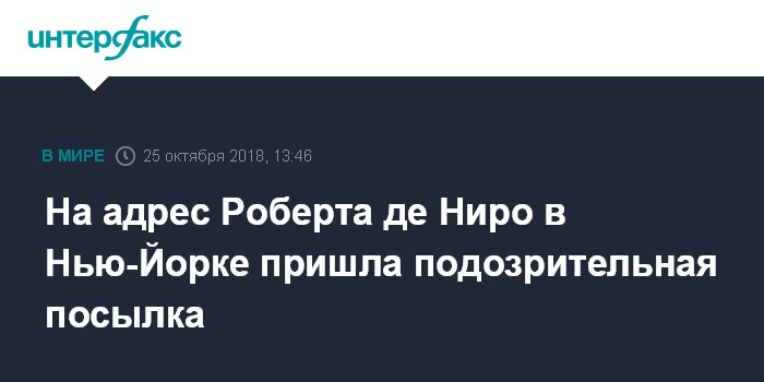 Москва. 25 октября. INTERFAX.RU - Посылку с подозрительным устройством получили в доме актера Роберта де Ниро в районе Трайбека в Нью-Йорке, сообщает телеканал NBC со ссылкой на источники.