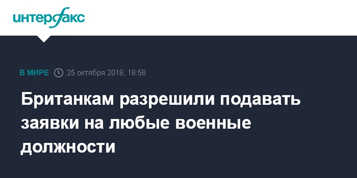 Москва. 25 октября. INTERFAX.RU - Министр обороны Великобритании Гэвин Уильямсон заявил, что британские подданные женского пола теперь смогут претендовать на должности во всех видах вооруженных сил королевства, сообщает в четверг британское издание Guardian.