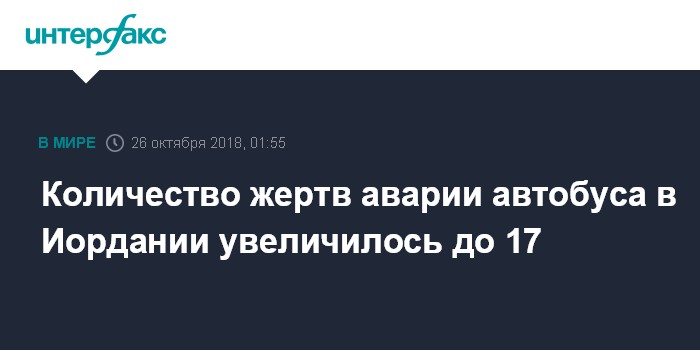 Москва. 26 октября. INTERFAX.RU - Количество жертв аварии автобуса в Иордании увеличилось до 17, сообщает в пятницу BBC News.