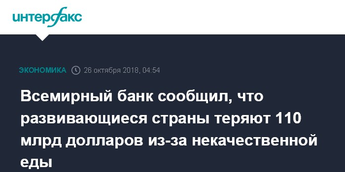 Москва. 26 октября. INTERFAX.RU - Развивающиеся страны ежегодно теряют 110 млрд долларов из-за некачественных продовольственных товаров, сообщил Всемирный банк в своем докладе.