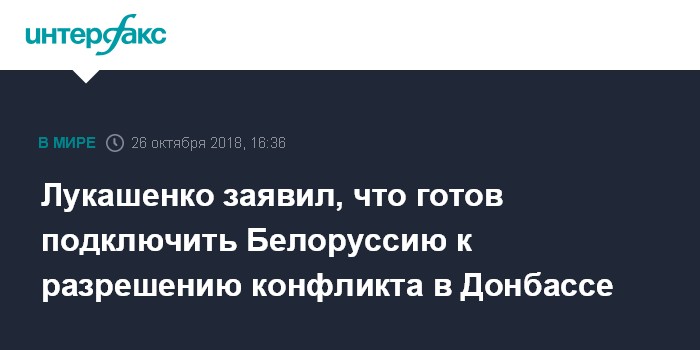 Москва. 26 октября. INTERFAX.RU - Президент Белоруссии Александр Лукашенко заявил, что Белоруссия готова подключиться к разрешению конфликта в Донбассе при согласии заинтересованных сторон.