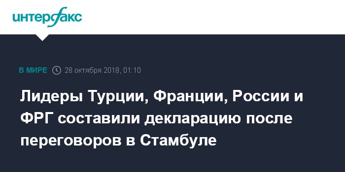 Москва. 28 октября. INTERFAX.RU - Президент Турции Реджеп Тайип Эрдоган, президент Франции Эммануэль Макрон, президент России Владимир Путин и канцлер ФРГ Ангела Меркель подтвердили свою твердую приверженность суверенитету, независимости, единству и территориальной целостности Сирийской Арабской Республики, а также целям и принципам Устава ООН; говорится в принятом по итогам переговоров на четырехстороннем саммите по Сирии в Стамбуле Совместном заявлении президентов и канцлера, опубликованном на сайте Кремля.